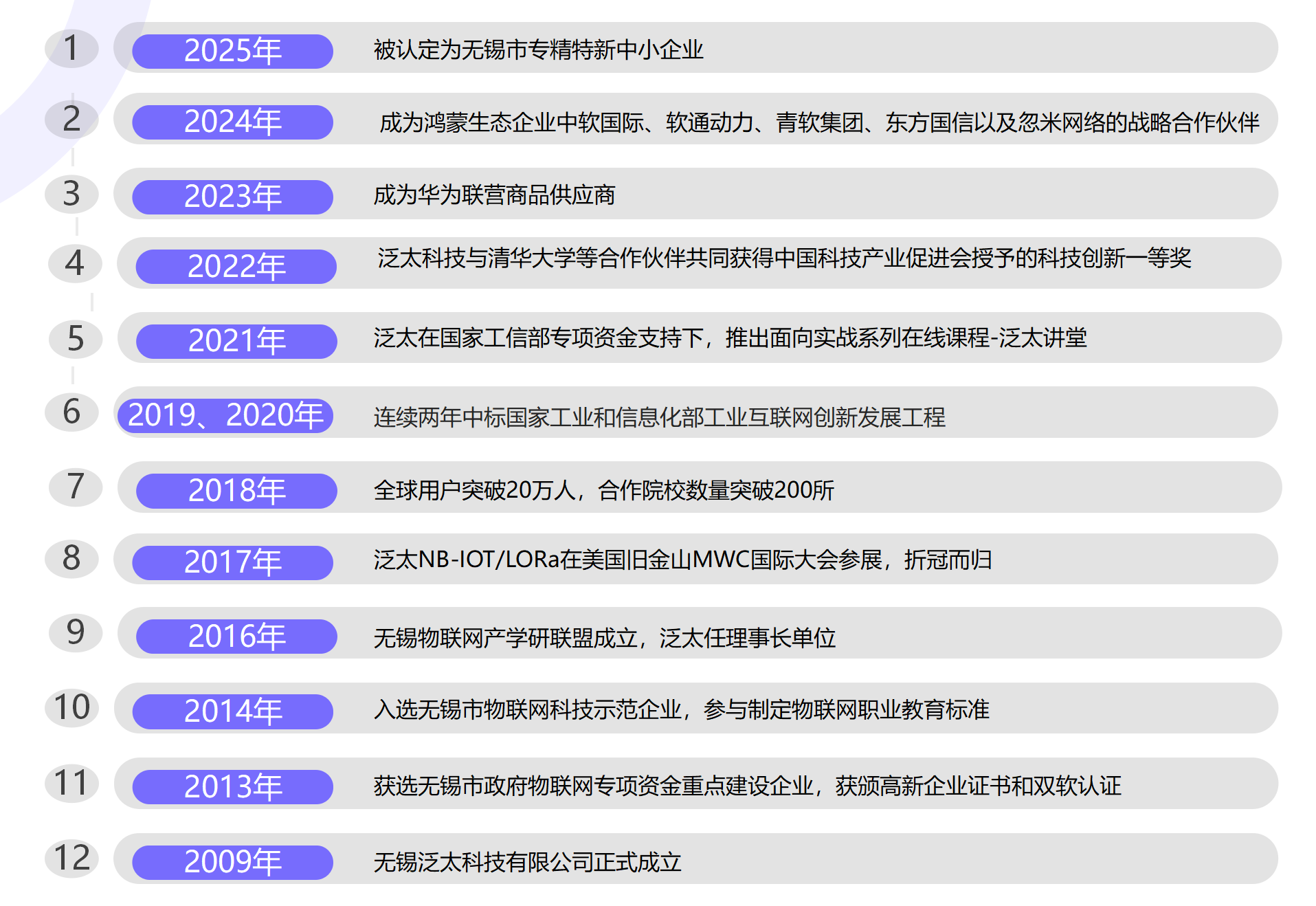 2019、2020年連續兩年中標國家工業(yè)和信息化部工業(yè)互聯(lián)網(wǎng)創(chuàng )新發(fā)展工程;2022年泛太科技與清華大學(xué)等單位合作的《工業(yè)物聯(lián)網(wǎng)智能標識與管控技術(shù)、平臺及應用》項目榮獲中國科技產(chǎn)業(yè)化促進(jìn)會(huì )頒發(fā)的第三屆科學(xué)技術(shù)獎-科技創(chuàng )新一等獎。2023年成為華為聯(lián)營(yíng)商品供應商。2024年成為鴻蒙生態(tài)企業(yè)中軟國際、軟通動(dòng)力、青軟集團、東方國信以及忽米網(wǎng)絡(luò )的戰略合作伙伴。2025年被認定為無(wú)錫市專(zhuān)精特新中小企業(yè)。