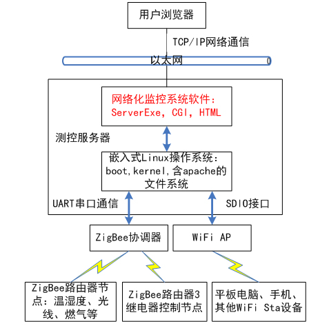 測控服務(wù)器內部集成ZigBee無(wú)線(xiàn)通信模塊,可設計為ZigBee協(xié)調器或路由器,ZigBee網(wǎng)絡(luò )拓撲模式靈活多變。