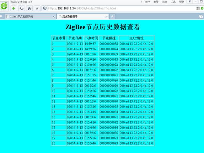 在測控服務(wù)器中構建Sqlite數據庫以及節點(diǎn)信息表,實(shí)時(shí)保存溫濕度傳感器、光線(xiàn)傳感器的采樣值,所有監測的歷史數據都可以顯示在客戶(hù)端瀏覽器的頁(yè)面上。