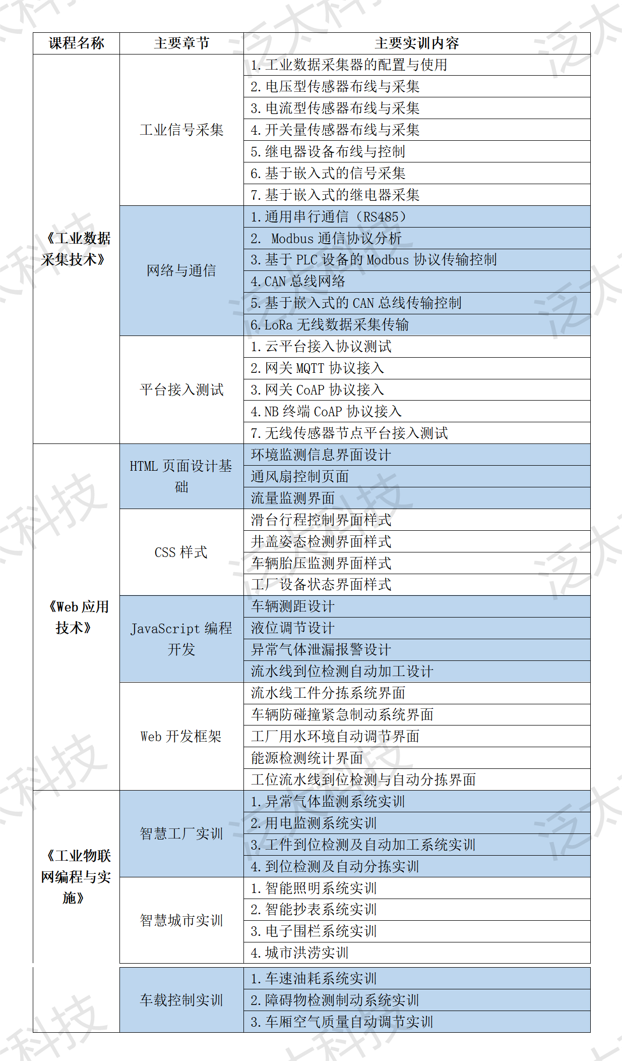 實(shí)訓臺支持0-5V/0-10V/4-20mA/0-20mA模擬量、開(kāi)關(guān)量、數字量等常用工業(yè)信號采集;集成CAN、RS485工業(yè)現場(chǎng)總線(xiàn)和工業(yè)以太網(wǎng)絡(luò ),支持ModbusRTU、ModbusTCP協(xié)議;包含ZigBee、WiFi、BlueTooth短距離和LoRa、NB-IoT、LTE遠距離無(wú)線(xiàn)傳感網(wǎng)絡(luò );集成工業(yè)以太網(wǎng)網(wǎng)關(guān),具有ModbusRTU、CAN、無(wú)線(xiàn)傳感網(wǎng)等異構網(wǎng)絡(luò )協(xié)議解析功能,支持ModbusTCP工業(yè)以太網(wǎng)協(xié)議,可通過(guò)MQTT、CoAP、HTTP物聯(lián)網(wǎng)協(xié)議接入工業(yè)物聯(lián)網(wǎng)云服務(wù)平臺;支持云服務(wù)平臺本地化部署或云端部署,提供API二次開(kāi)發(fā)接口。提供基于智慧工廠(chǎng)、智慧城市、車(chē)載控制、?;返刃袠I(yè)的數據采集監控系統的嵌入式開(kāi)發(fā)、Android應用開(kāi)發(fā)、Web應用開(kāi)發(fā)、標識解析實(shí)訓案例。實(shí)訓臺主要由工業(yè)以太網(wǎng)網(wǎng)關(guān)、無(wú)線(xiàn)傳感節點(diǎn)區、網(wǎng)孔實(shí)訓區、以及臺體框架(含電源接線(xiàn)端子、傳感器接線(xiàn)端子、通信接口面板等)組成。