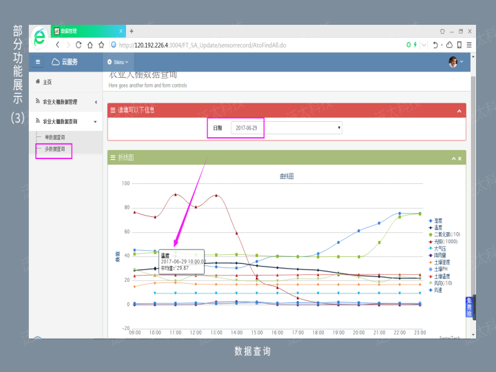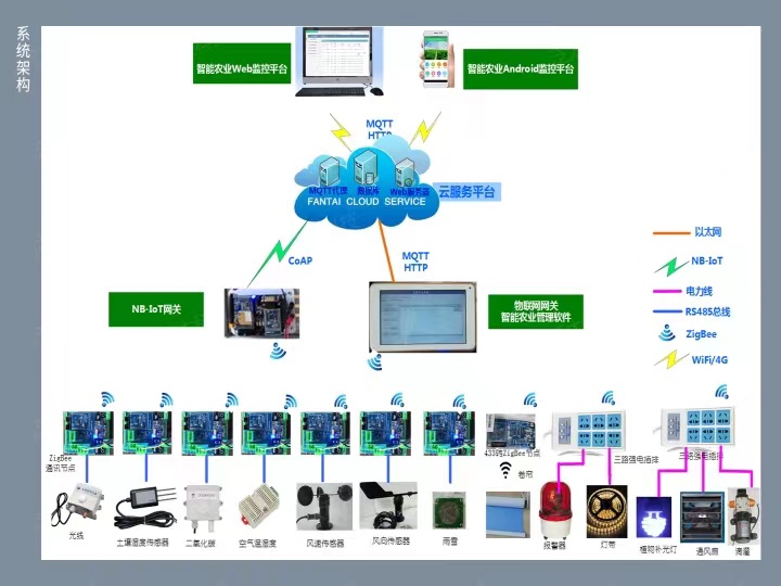 系統定時(shí)采集大棚內空氣溫濕度、光照度、土壤濕度、二氧化碳濃度等數據,經(jīng)過(guò)無(wú)線(xiàn)傳感網(wǎng)傳送給物聯(lián)網(wǎng)網(wǎng)關(guān)。系統會(huì )在環(huán)境參數超過(guò)預設值時(shí)進(jìn)行聯(lián)動(dòng)處理,如控制通風(fēng)扇、補光燈、滴灌、遮陽(yáng)簾等執行器,調整大棚內環(huán)境或提前預警。系統將農業(yè)環(huán)境信息通過(guò)以太網(wǎng)、移動(dòng)網(wǎng)絡(luò )或窄帶廣域網(wǎng)傳送給農業(yè)云服務(wù)平臺進(jìn)行存儲、統計分析,以WEB頁(yè)面集中展示農業(yè)生產(chǎn)環(huán)境的實(shí)時(shí)數據、趨勢走向、設備狀態(tài)等。同時(shí),系統支持視頻采集,用戶(hù)可通過(guò)物聯(lián)網(wǎng)網(wǎng)關(guān)、移動(dòng)終端瀏覽農業(yè)現場(chǎng)視頻。